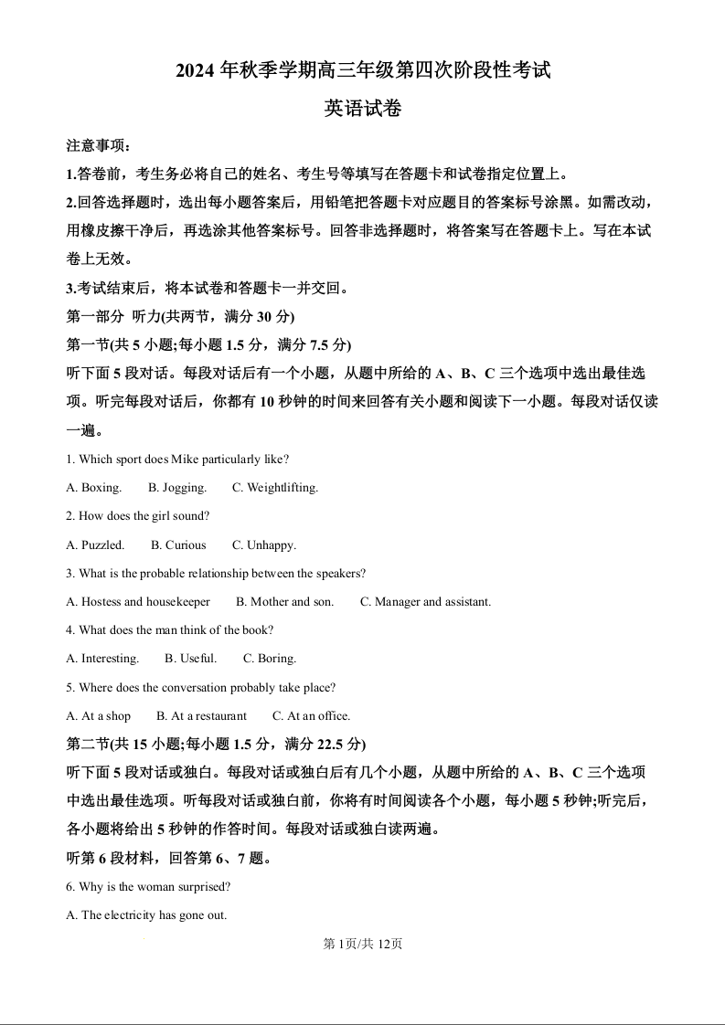 甘肃省平凉市一中等高中2025届高三上学期第四次阶段性考试英语(原卷版)