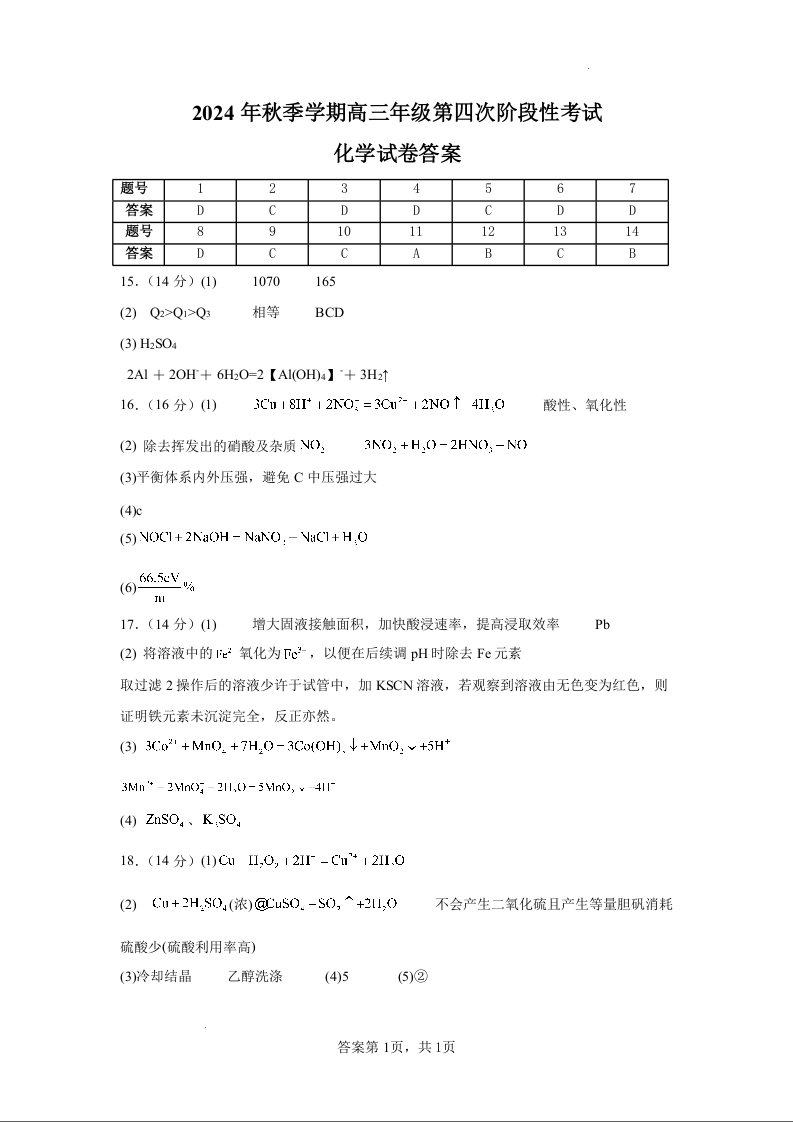 甘肃省平凉市一中等高中2025届高三上学期第四次阶段性考试化学答案