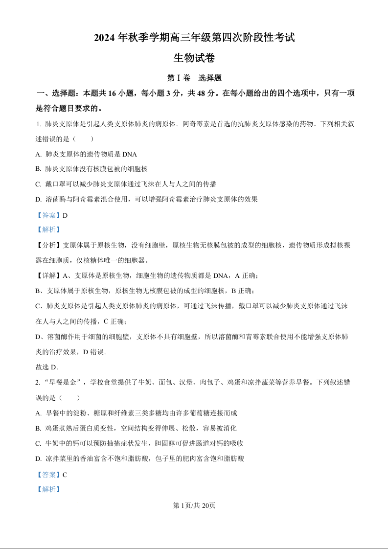 甘肃省平凉市一中等高中2025届高三上学期第四次阶段性考试生物(精品解析版)