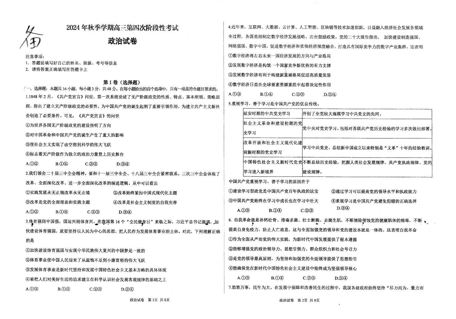 甘肃省平凉市一中等高中2025届高三上学期第四次阶段性考试政治