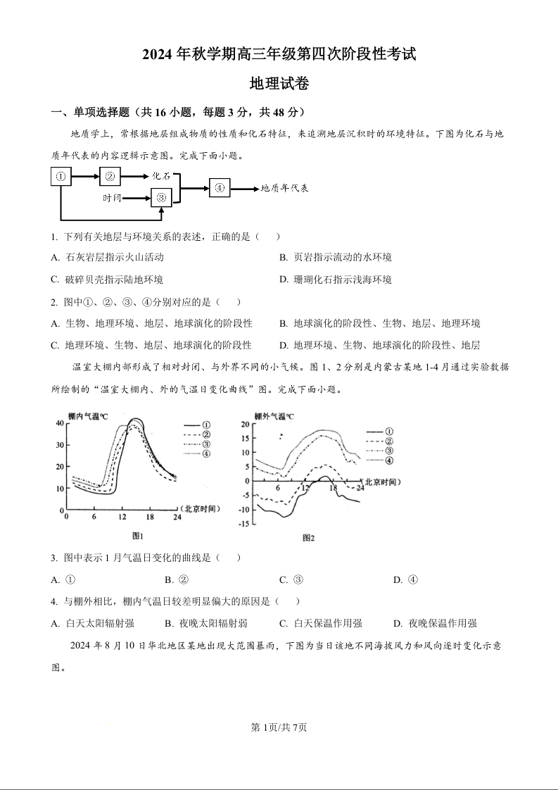 甘肃省平凉市一中等高中2025届高三上学期第四次阶段性考试地理(原卷版)