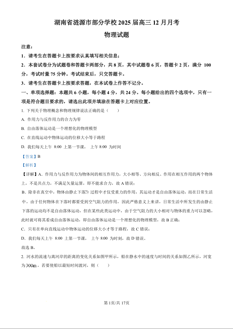 湖南省娄底市涟源市部分学校2025届高三上学期12月月考物理(精品解析版)