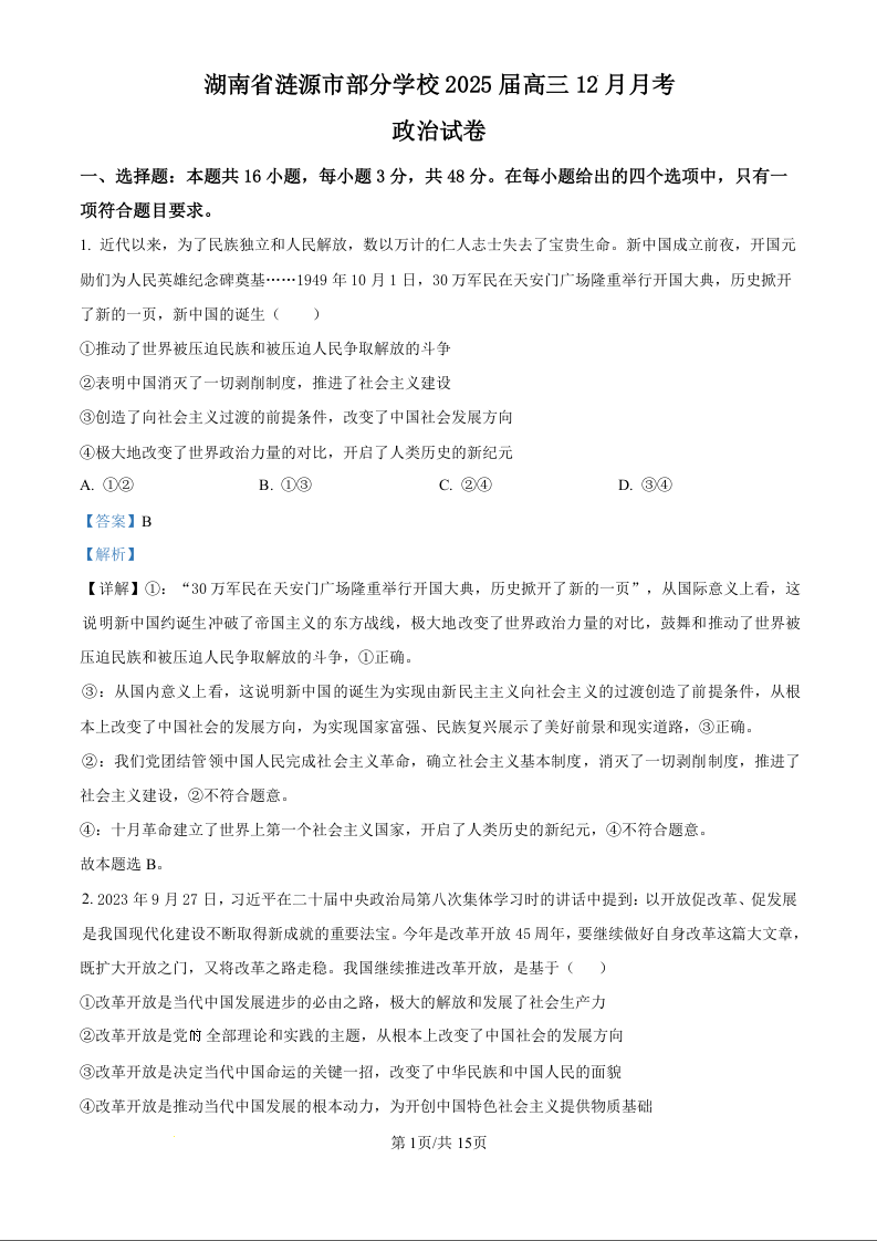 湖南省娄底市涟源市部分学校2025届高三上学期12月月考政治(精品解析版)