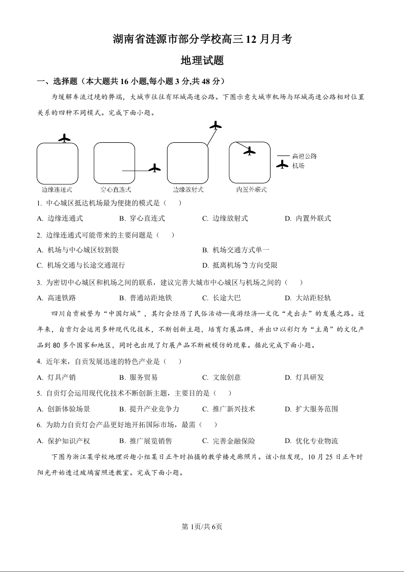湖南省娄底市涟源市部分学校2025届高三上学期12月月考地理(原卷版)