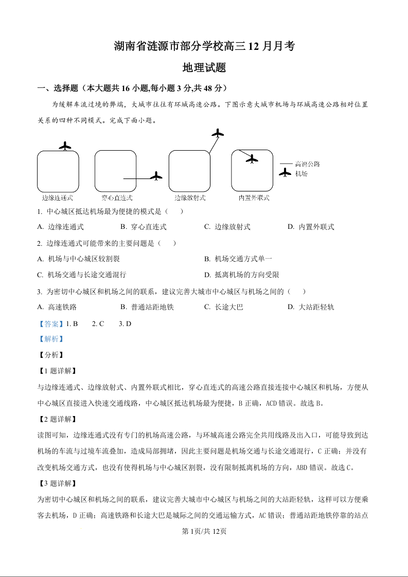 湖南省娄底市涟源市部分学校2025届高三上学期12月月考地理(精品解析版)