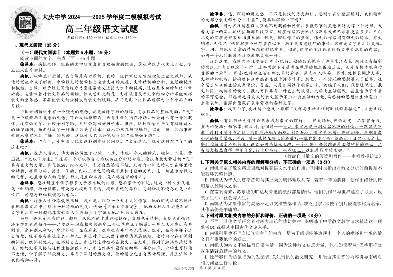 黑龙江省大庆中学2025届高三上学期第二次模拟考试语文