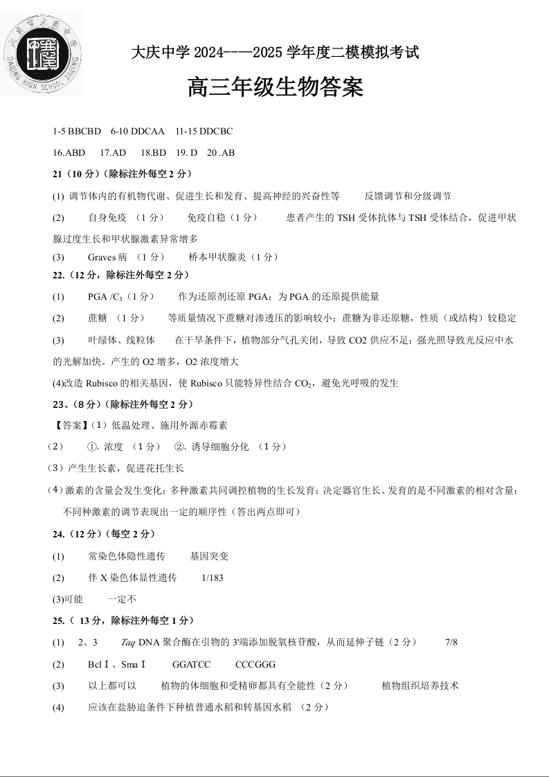 黑龙江省大庆中学2025届高三上学期第二次模拟考试生物答案