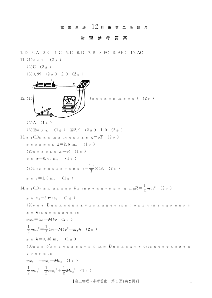 河北省邢台市2025届高三上学期第二次联考物理答案
