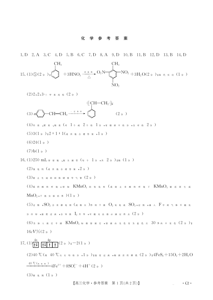 河北省邢台市2025届高三上学期第二次联考化学答案