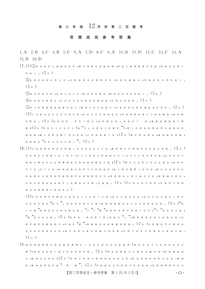 河北省邢台市2025届高三上学期第二次联考政治答案