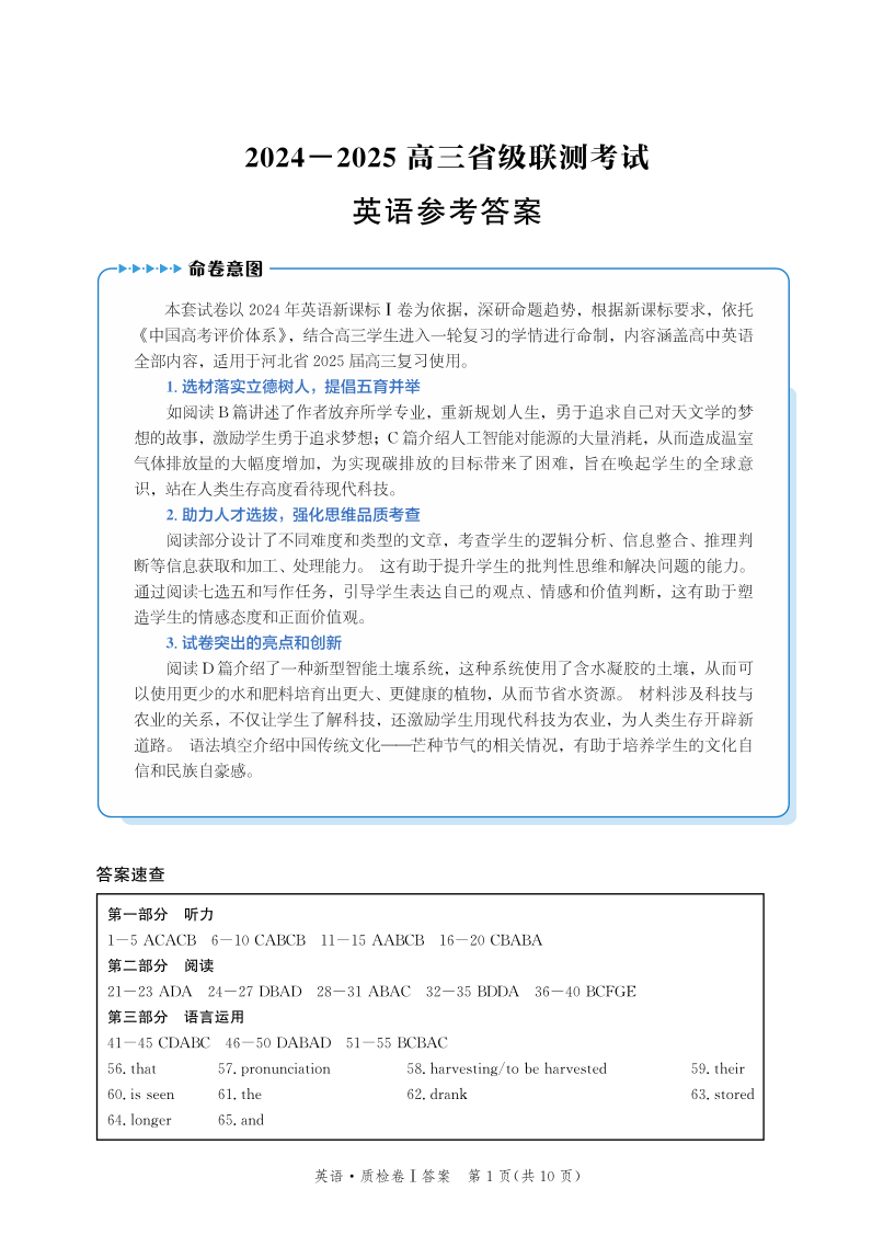 河北省省级联考2025届高三上学期1月期末考试英语答案