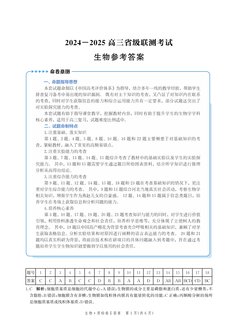 河北省省级联考2025届高三上学期1月期末考试生物答案