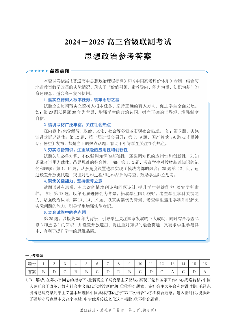 河北省省级联考2025届高三上学期1月期末考试政治答案