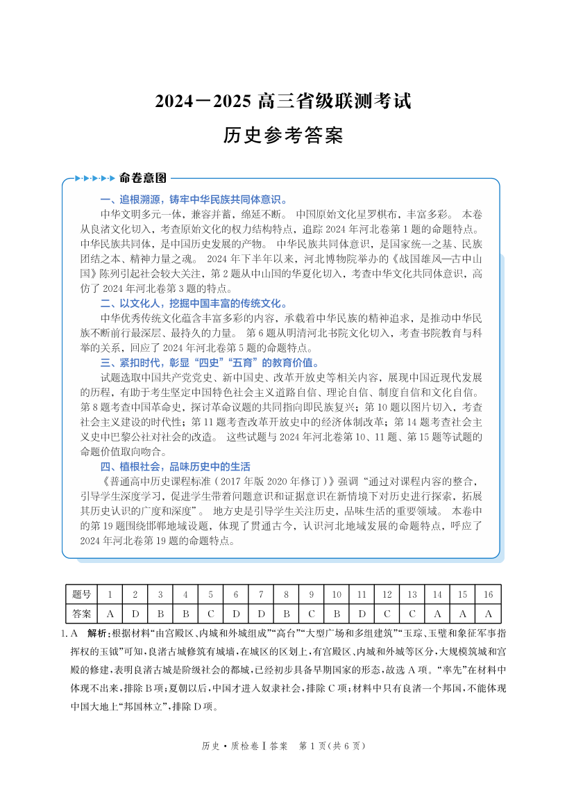河北省省级联考2025届高三上学期1月期末考试历史答案