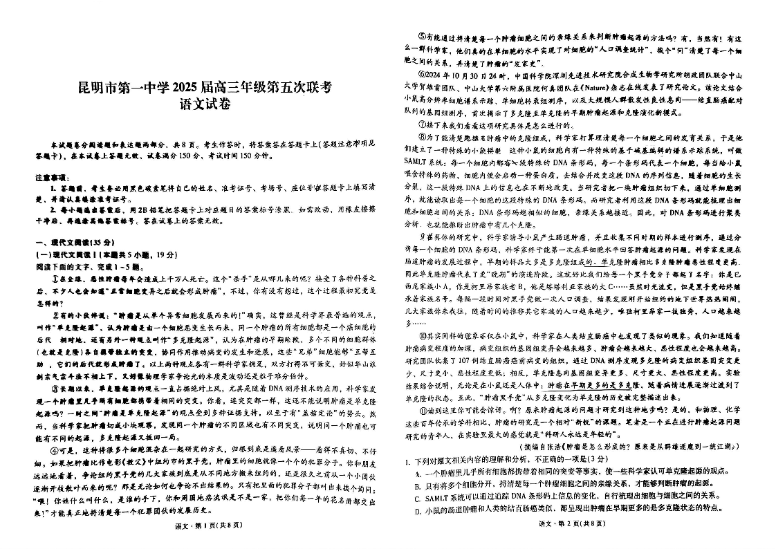 云南省昆明市第一中学2025届高三上学期第五次联考语文