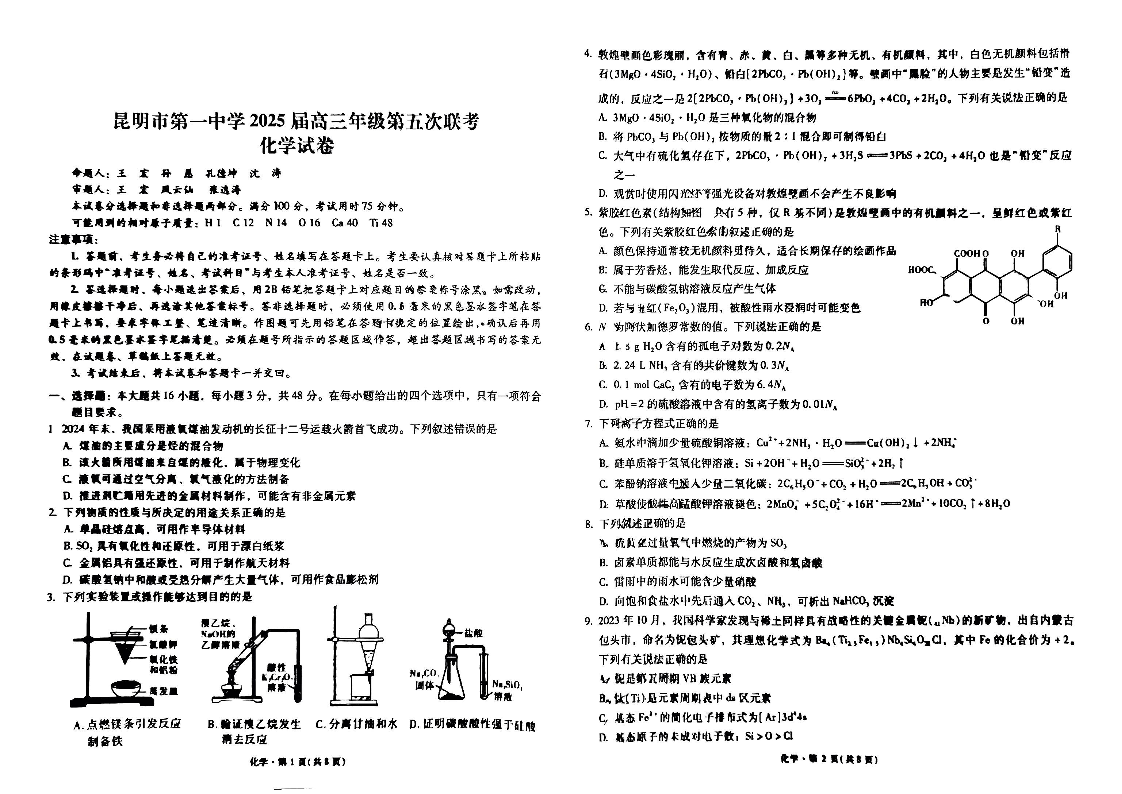云南省昆明市第一中学2025届高三上学期第五次联考化学