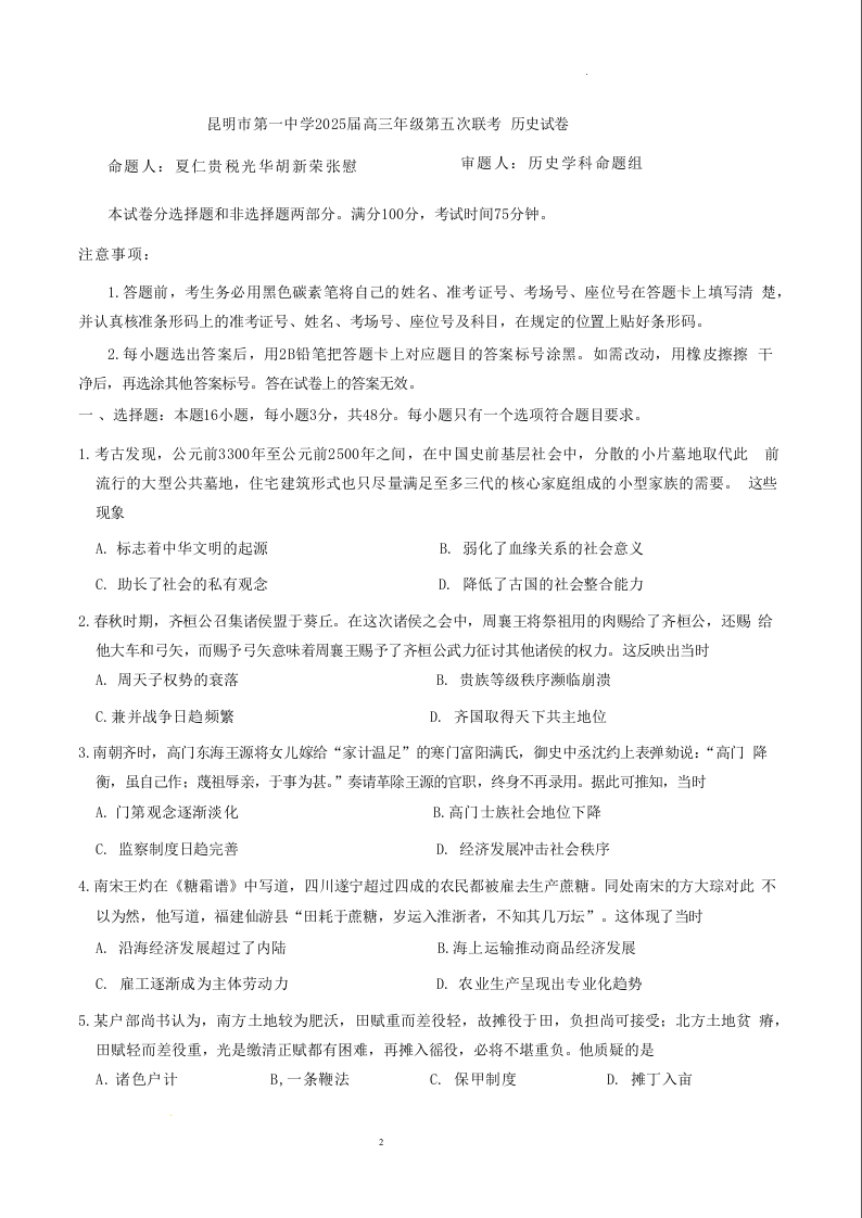 云南省昆明市第一中学2025届高三上学期第五次联考历史+答案
