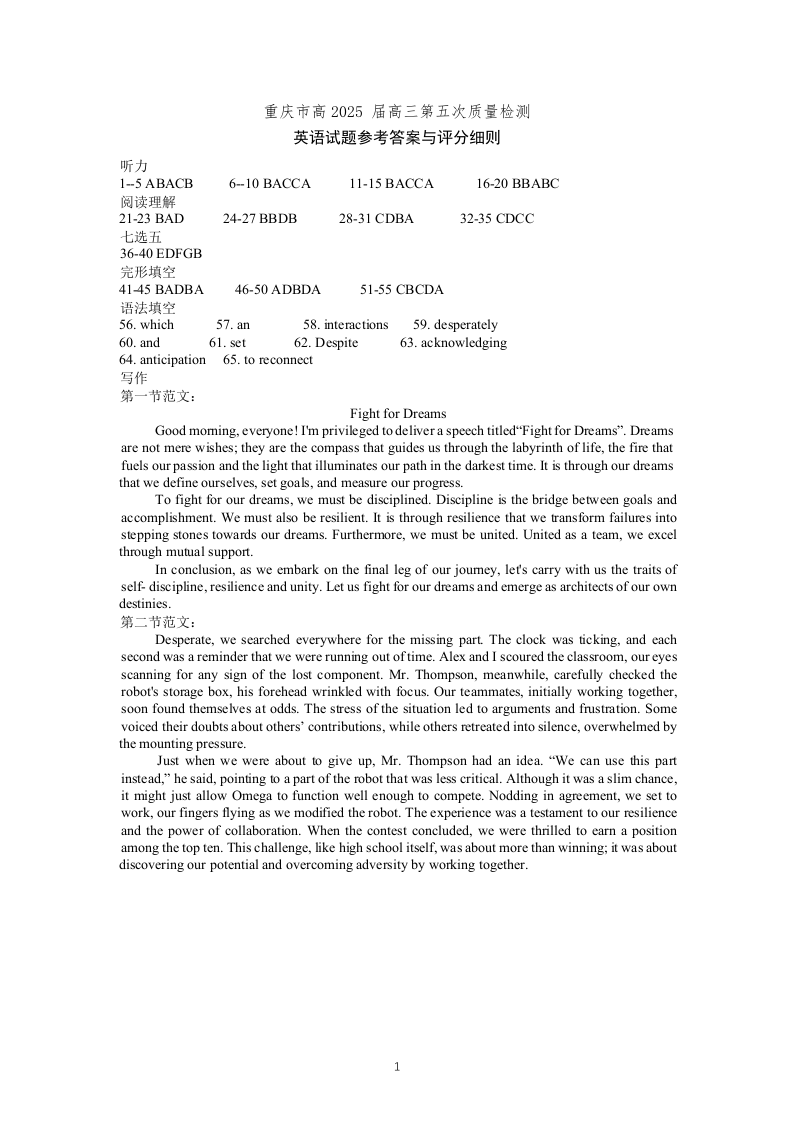 重庆市南开中学2025届高三第五次质量检测英语答案