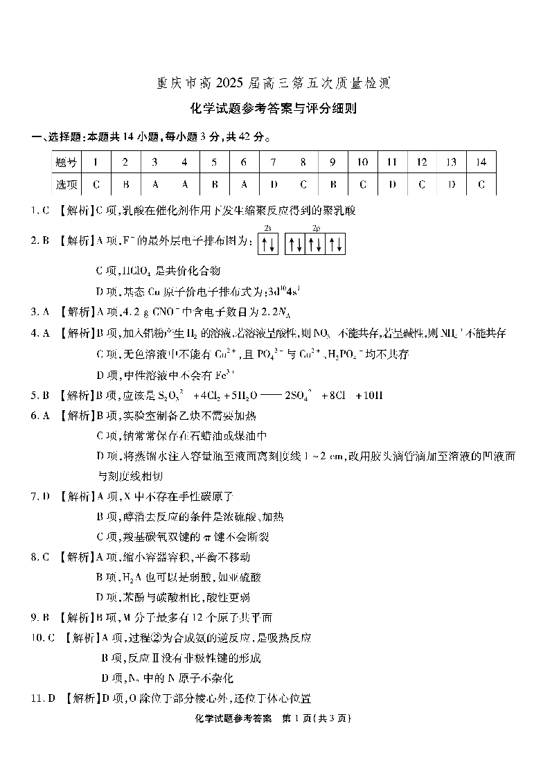 重庆市南开中学2025届高三第五次质量检测化学答案