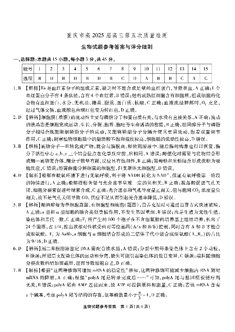 重庆市南开中学2025届高三第五次质量检测生物答案