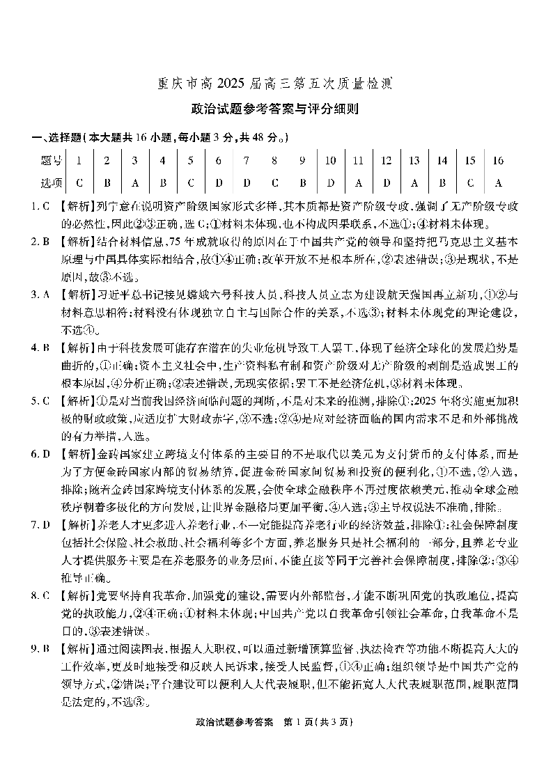 重庆市南开中学2025届高三第五次质量检测政治答案