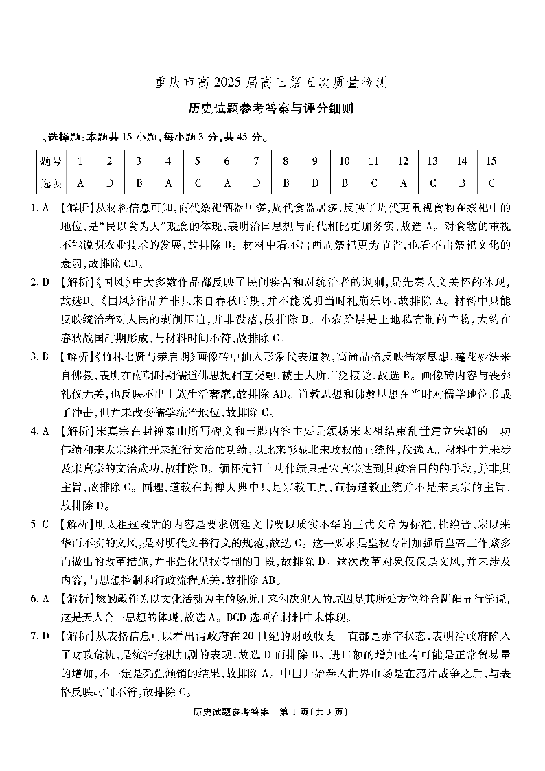 重庆市南开中学2025届高三第五次质量检测历史答案