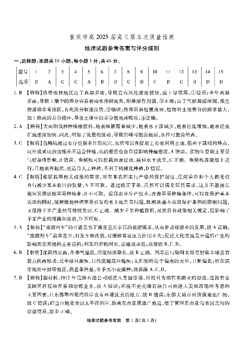 重庆市南开中学2025届高三第五次质量检测地理答案