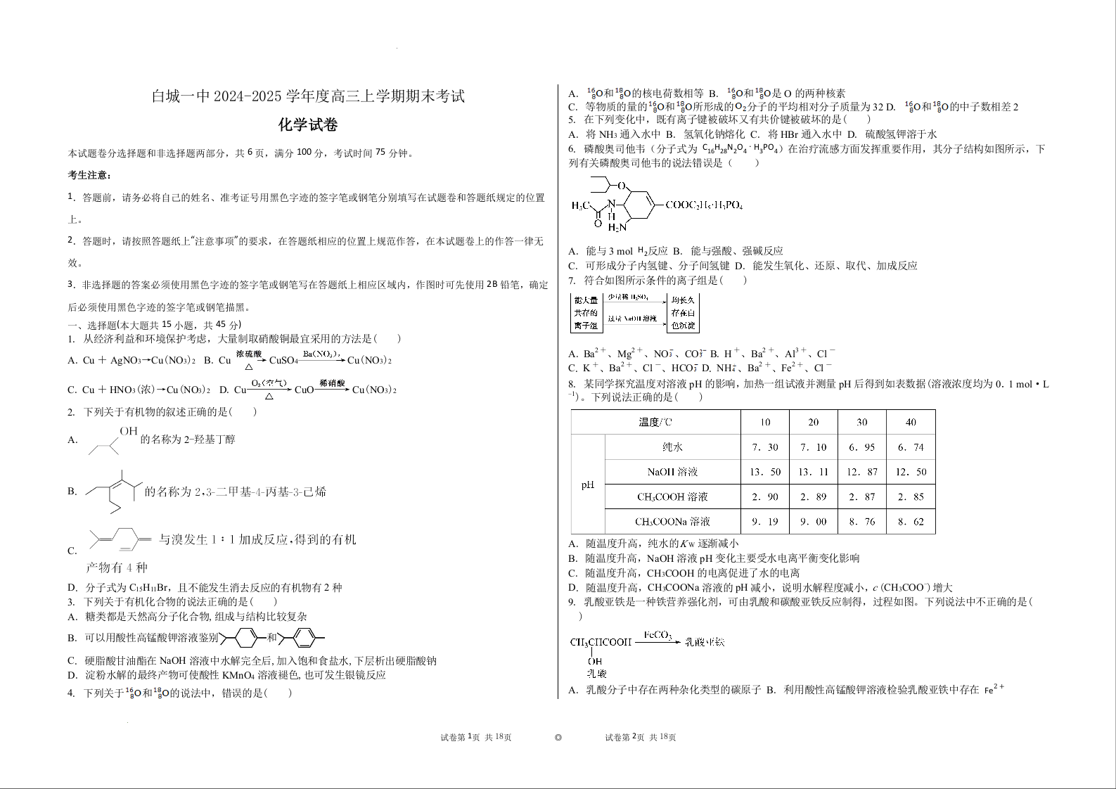 吉林省白城市第一中学2025届高三上学期1月期末考试化学+答案