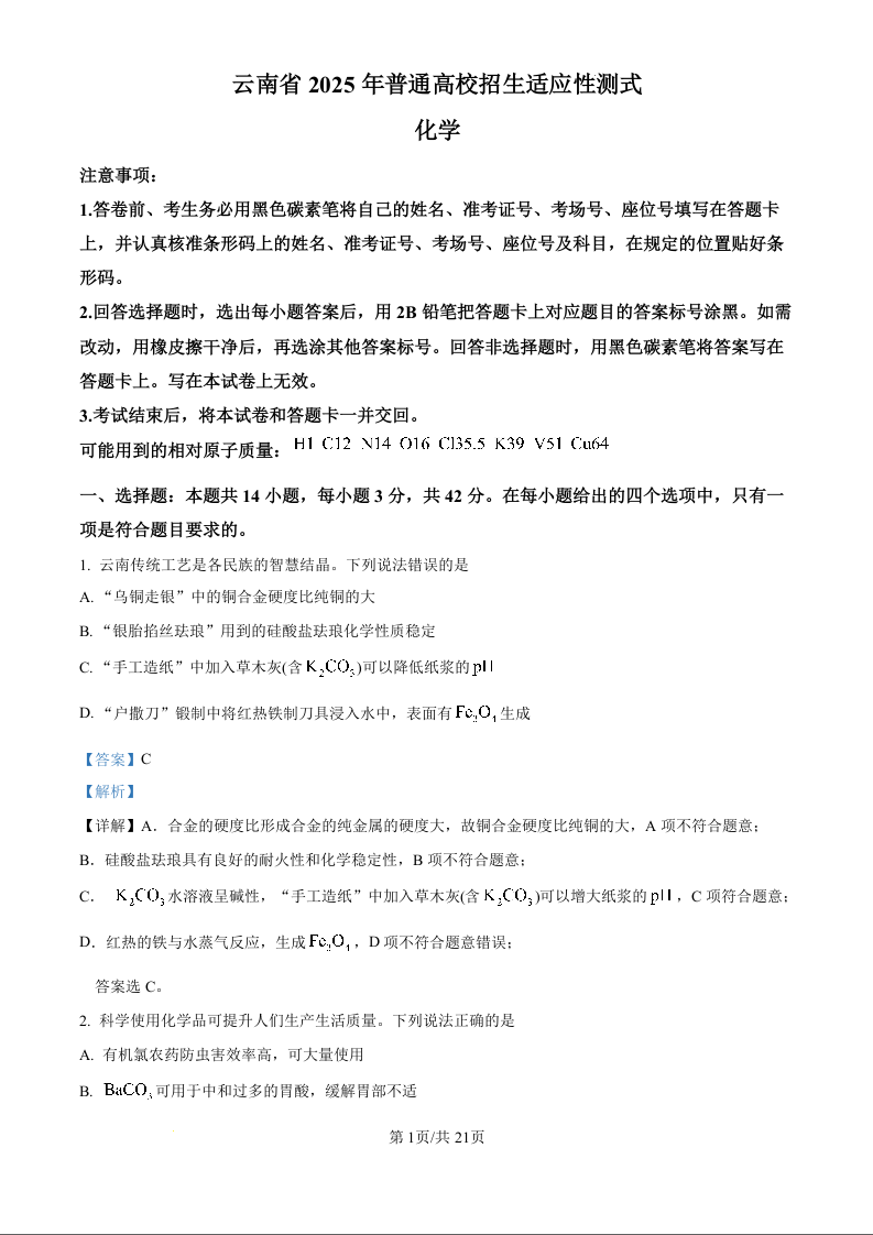 新八省联考2025年云南省高考综合改革适应性演练化学(精品解析版)