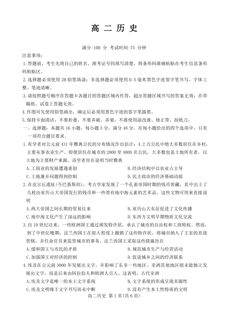 安徽省部分学校2024-2025学年高二上学期开学考试历史