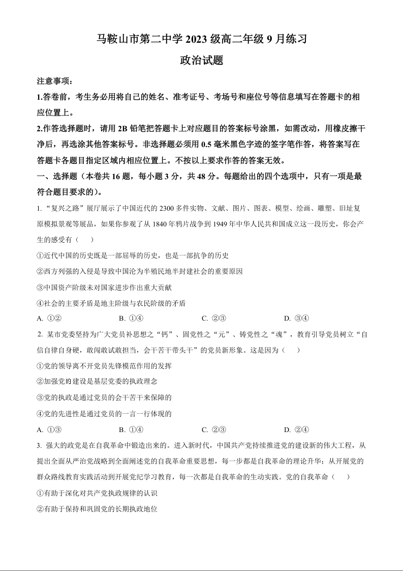 安徽省马鞍山市第二中学2023级高二年级9月练习政治(原卷版)