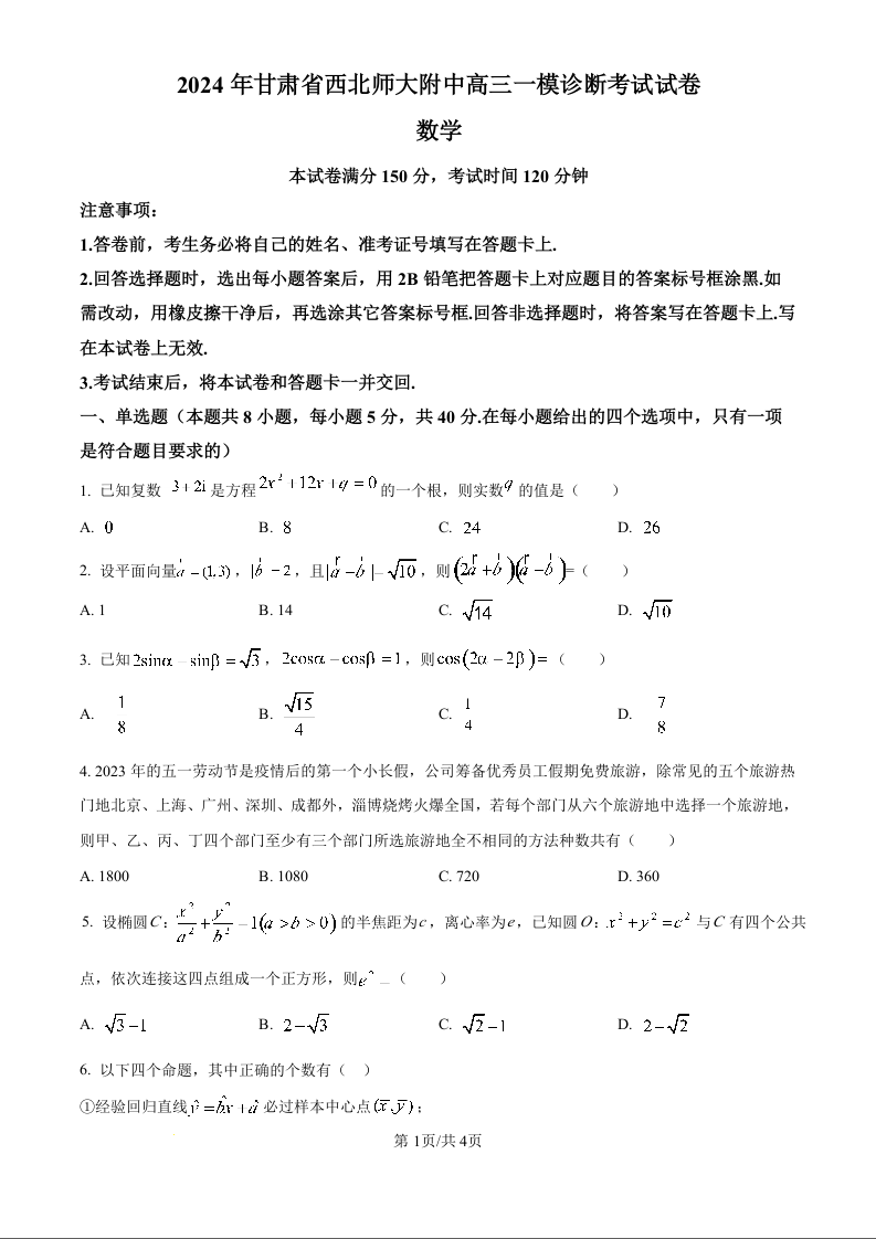 甘肃省西北师范大学附属中学2025届高三上学期一模诊断考试数学(原卷版)