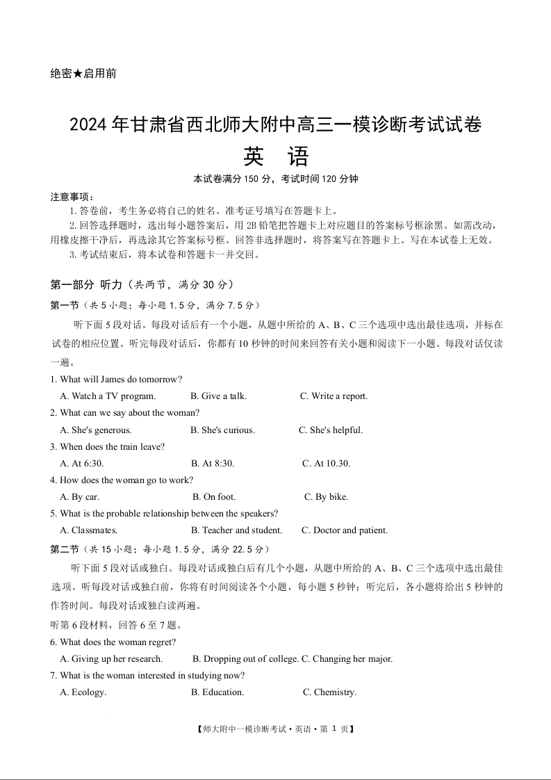 甘肃省西北师范大学附属中学2025届高三上学期一模诊断考试英语+答案