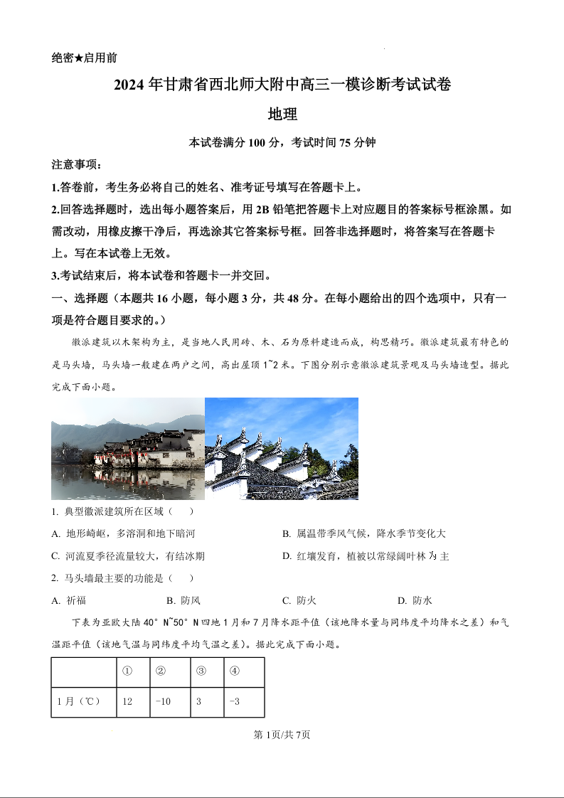 甘肃省西北师范大学附属中学2025届高三上学期一模诊断考试地理(原卷版)