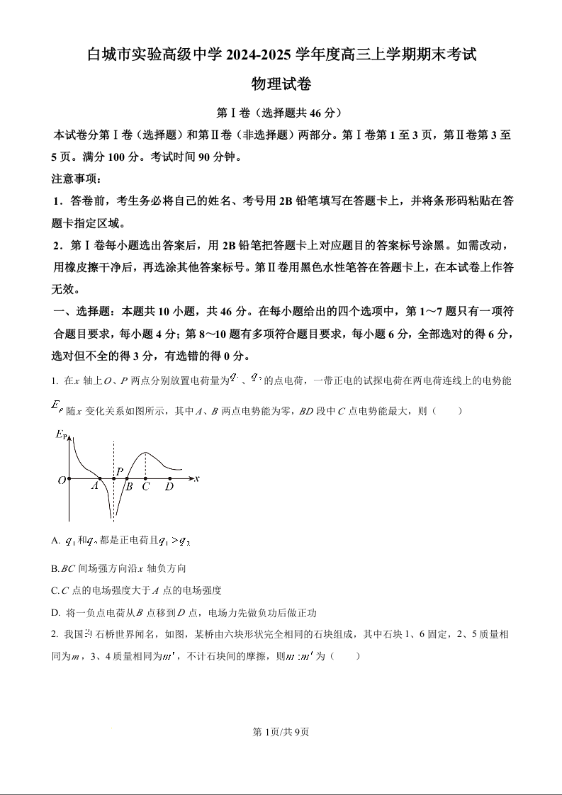 吉林省白城市实验高级中学2025届高三上学期1月期末考试物理(原卷版)