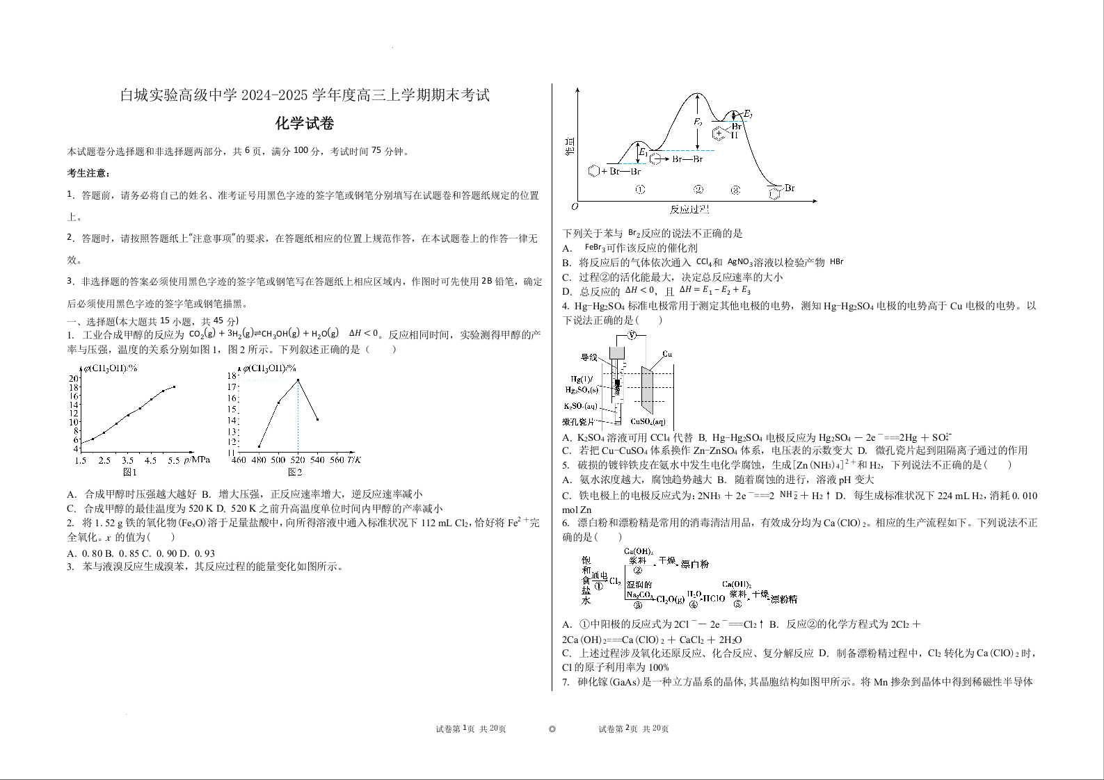 吉林省白城市实验高级中学2025届高三上学期1月期末考试化学+答案