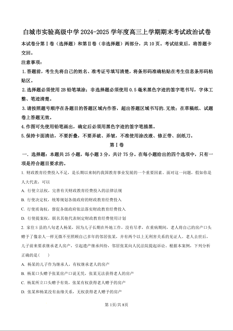 吉林省白城市实验高级中学2025届高三上学期1月期末考试政治(原卷版)