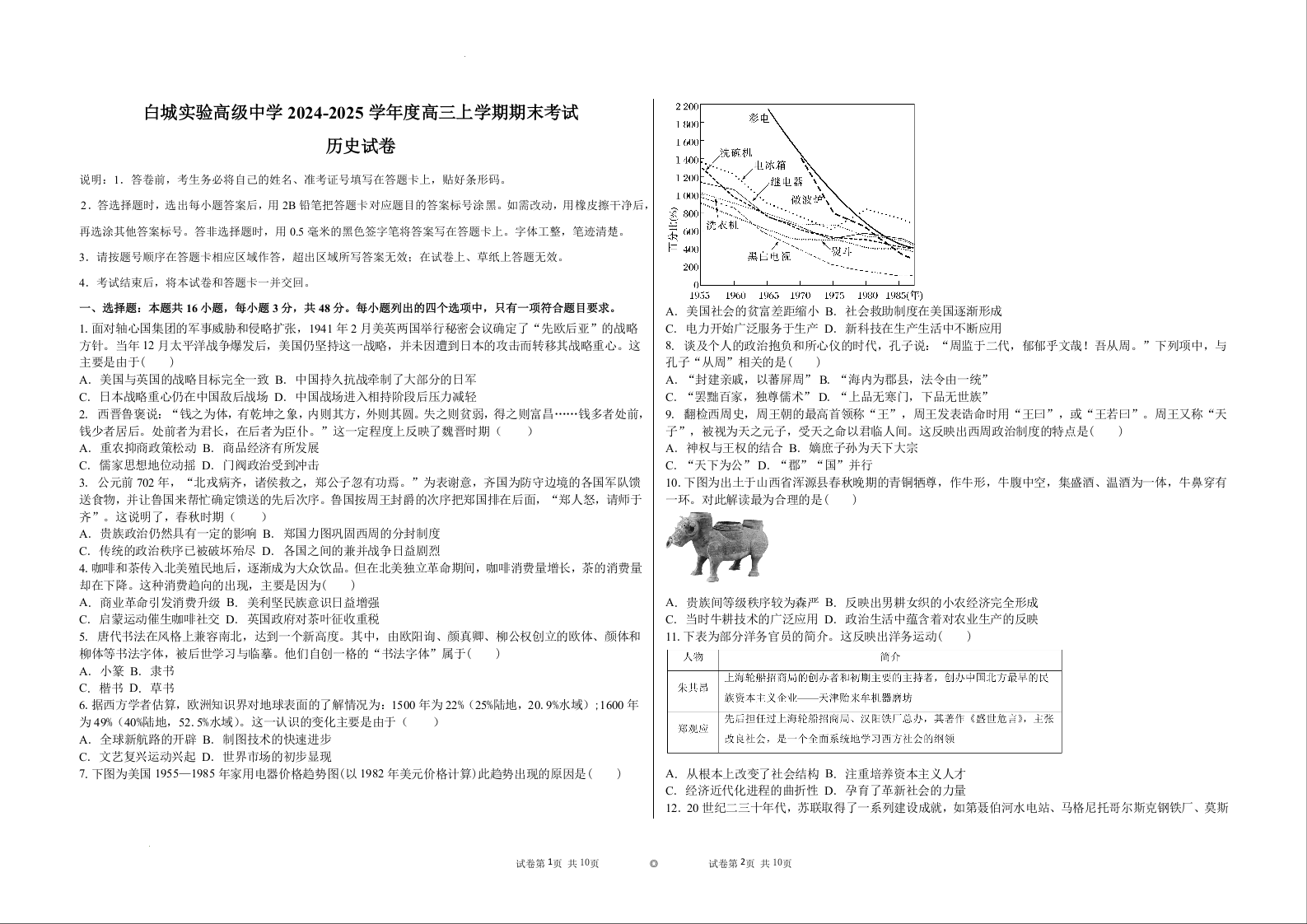 吉林省白城市实验高级中学2025届高三上学期1月期末考试历史+答案