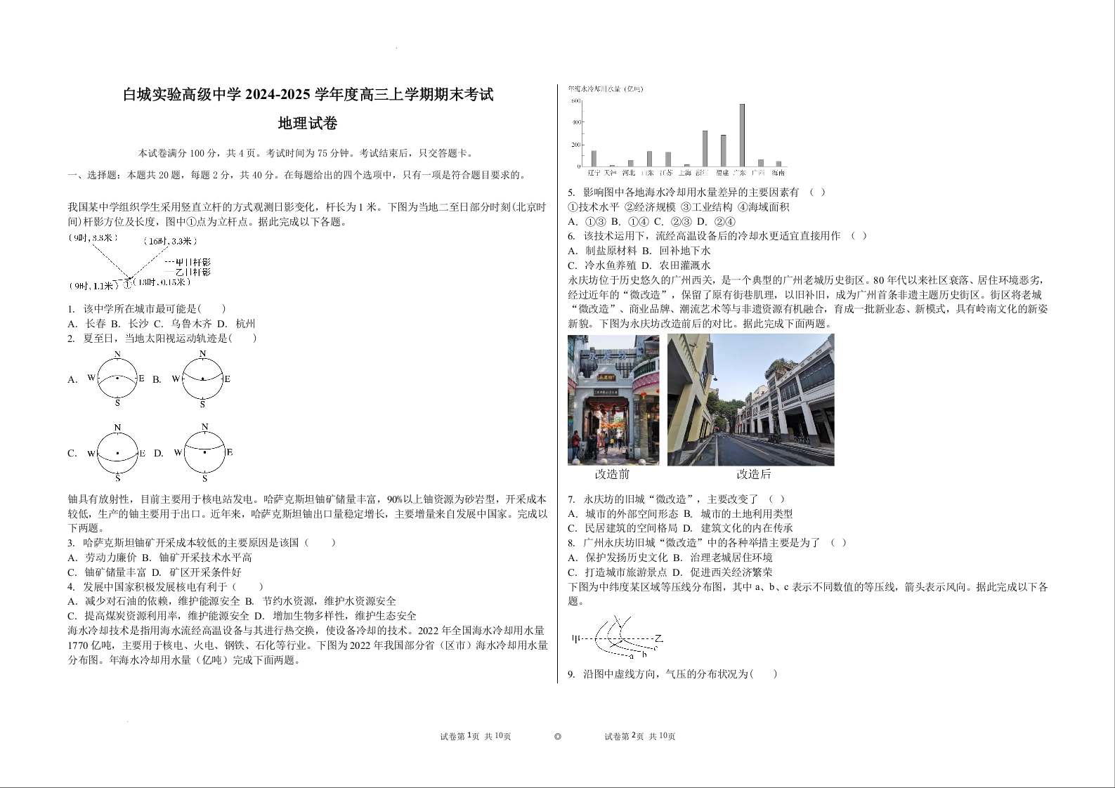 吉林省白城市实验高级中学2025届高三上学期1月期末考试地理+答案