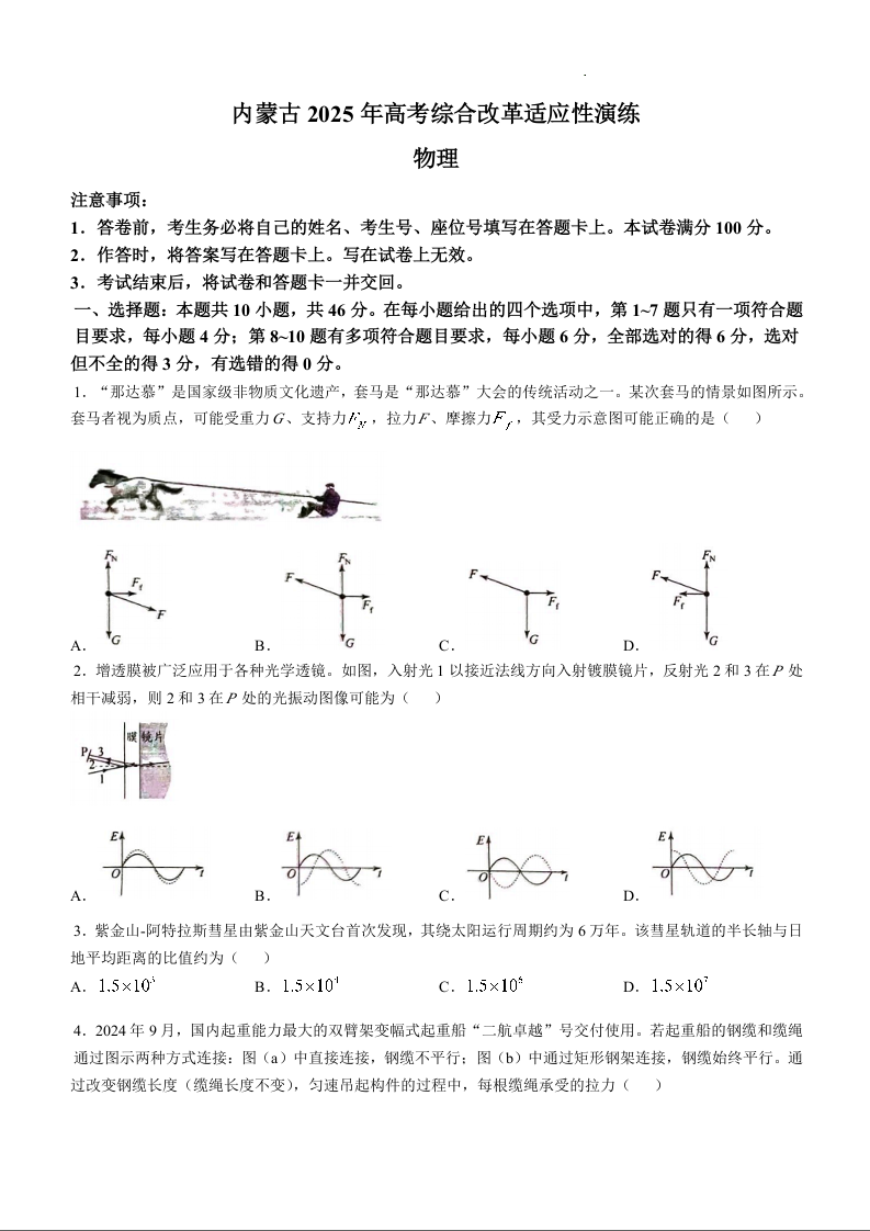 新八省联考2025年内蒙古高考综合改革适应性演练物理