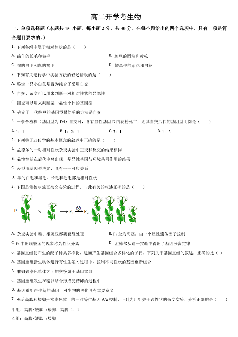 吉林省通化市梅河口市第五中学2024-2025学年高二上学期开学考试生物+答案