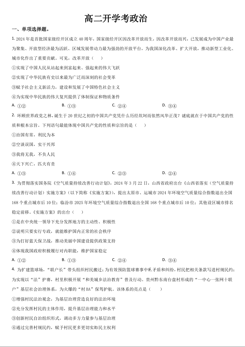 吉林省通化市梅河口市第五中学2024-2025学年高二上学期开学考试政治+答案