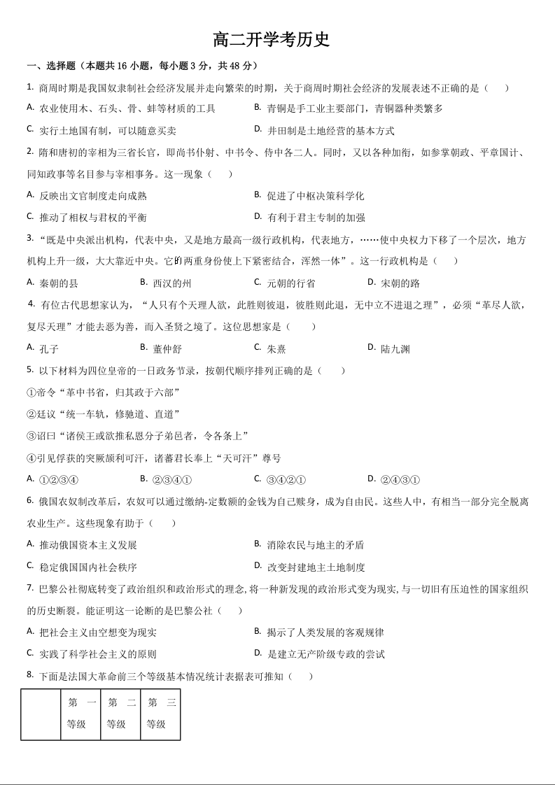 吉林省通化市梅河口市第五中学2024-2025学年高二上学期开学考试历史+答案