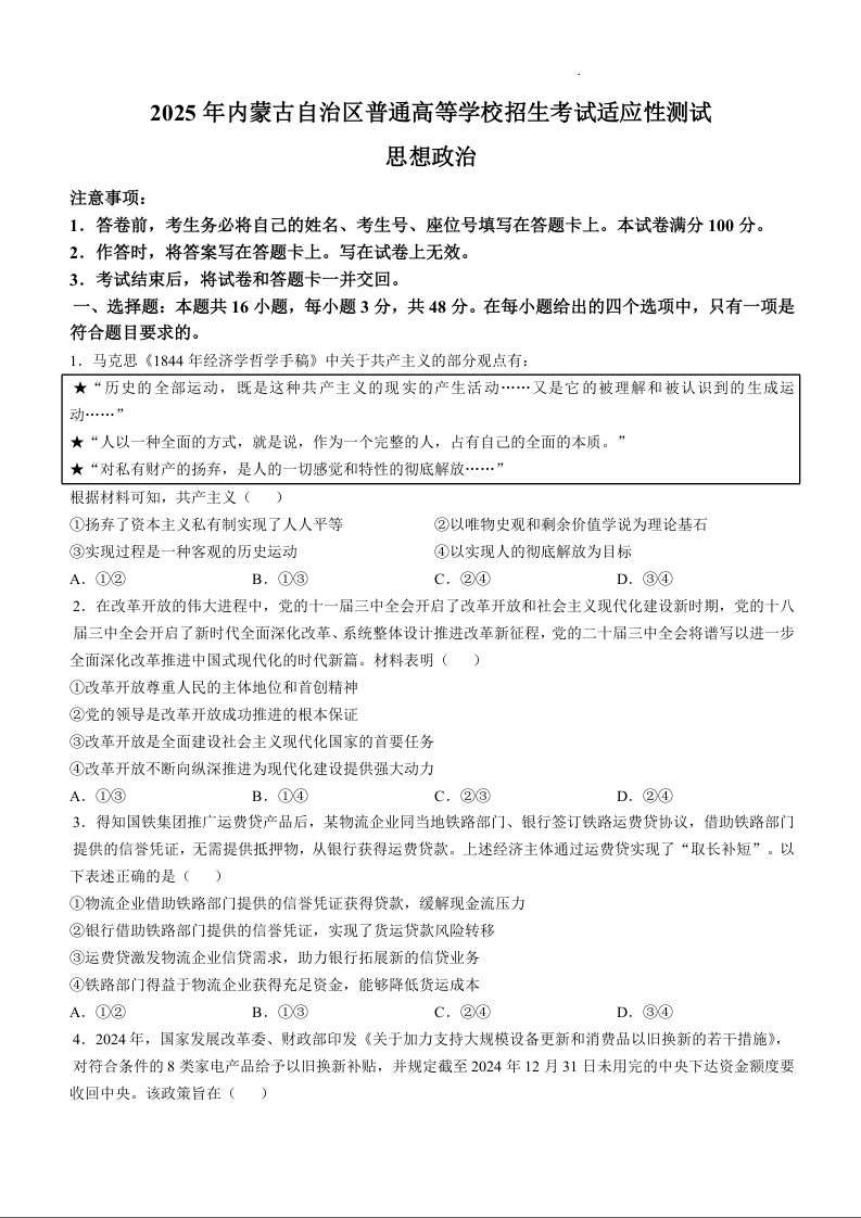 新八省联考2025年内蒙古高考综合改革适应性演练政治