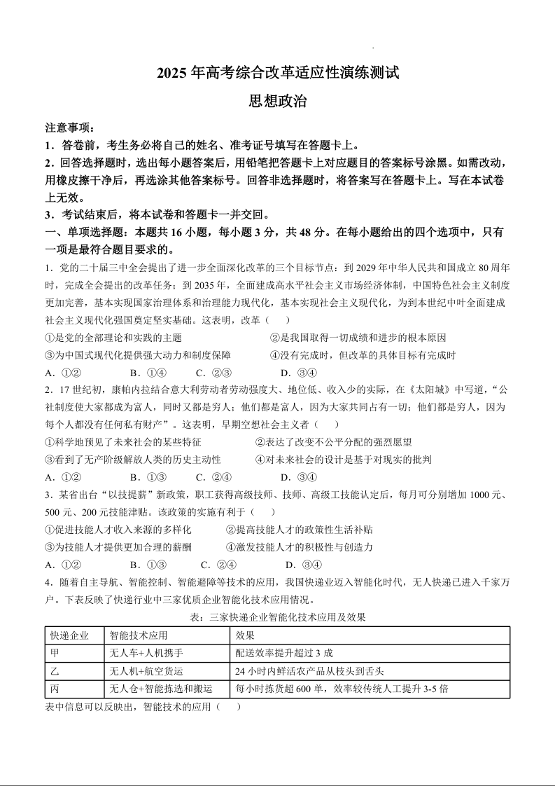 【四川卷】新八省联考2025年四川省高考综合改革适应性演练政治