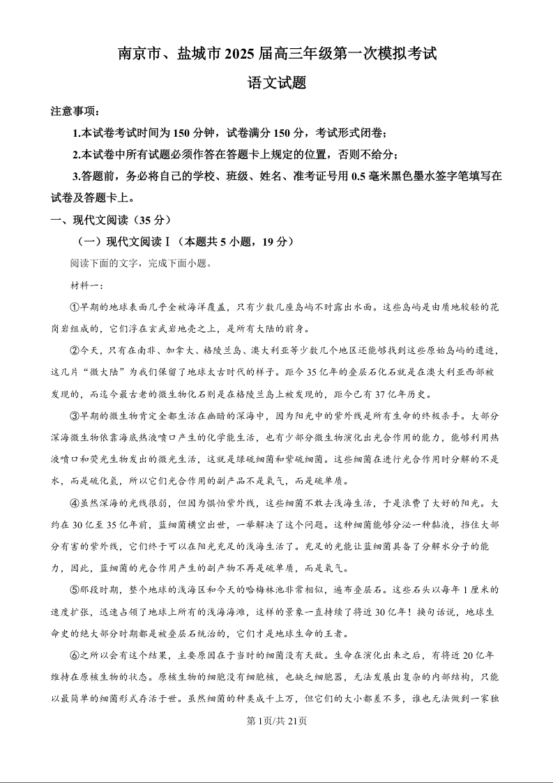 江苏省南京市、盐城市2025届高三年级第一次模拟考试语文(精品解析版)