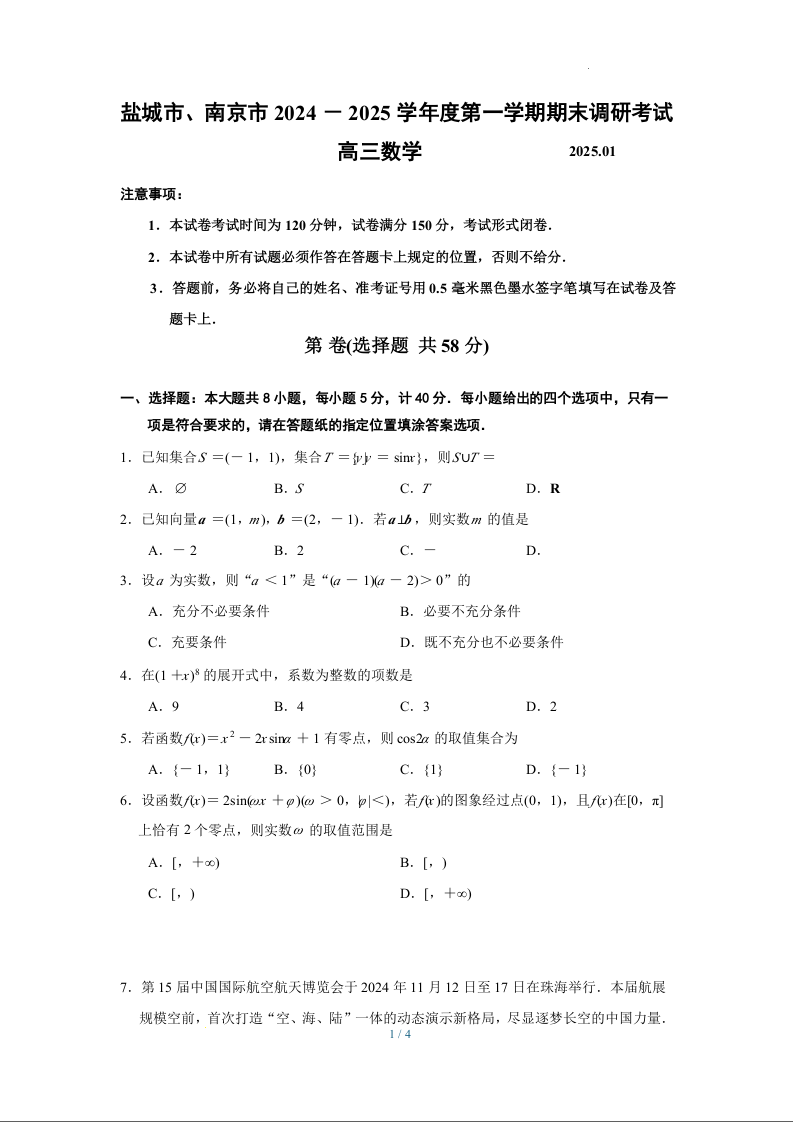 江苏省南京市、盐城市2025届高三年级第一次模拟考试数学