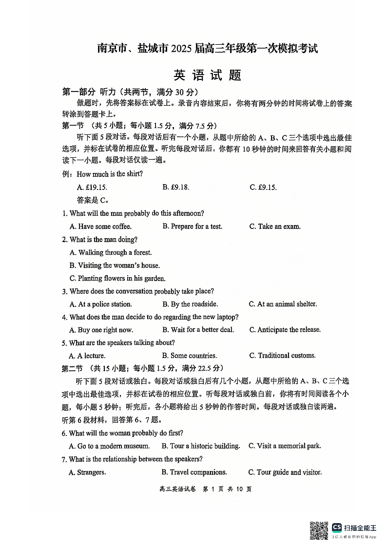 江苏省南京市、盐城市2025届高三年级第一次模拟考试英语