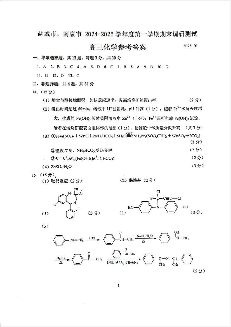 江苏省南京市、盐城市2025届高三年级第一次模拟考试化学答案