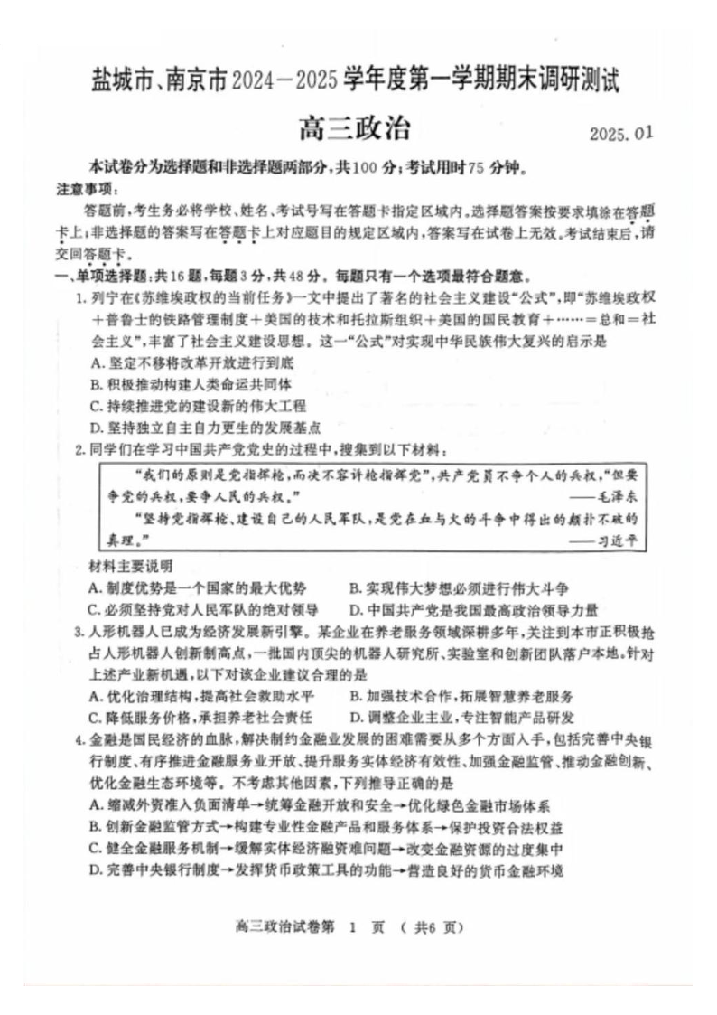 江苏省南京市、盐城市2025届高三年级第一次模拟考试政治